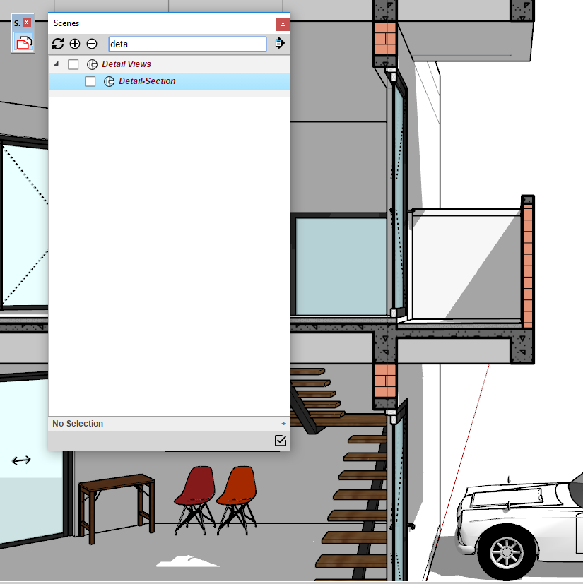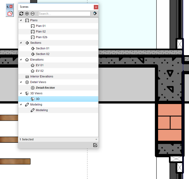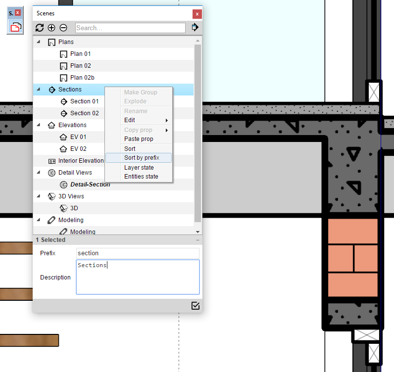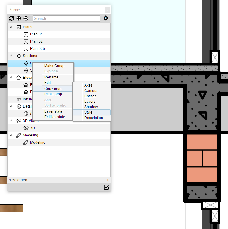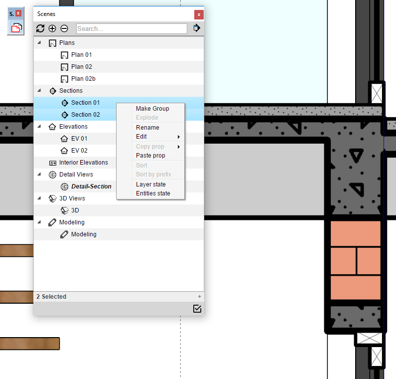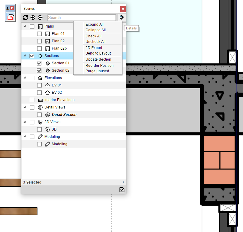 Manage the scenes, copy/paste properties, reorder position, 2D export, send to Layout...