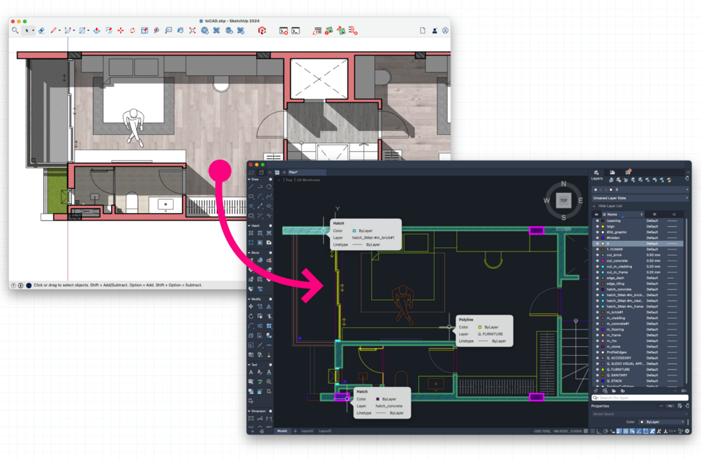 Transform your SketchUp models into detailed 2D CAD drawings with ease using the Curic toCAD. Overcome the limitations of SketchUp’s native export tool by utilizing advanced features such as: