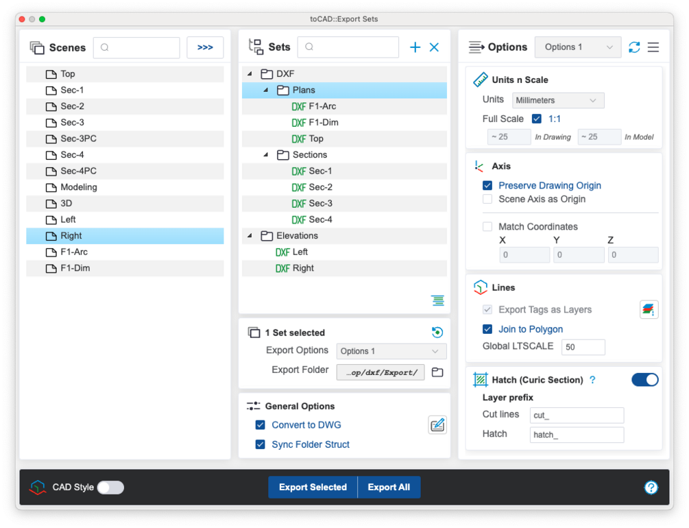 Transform your SketchUp models into detailed 2D CAD drawings with ease using the Curic toCAD. Overcome the limitations of SketchUp’s native export tool by utilizing advanced features such as: