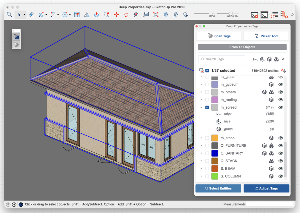 Deep Properties is a SketchUp plugin that manages complex 3D models, focusing on Tags (Layers) and Materials.