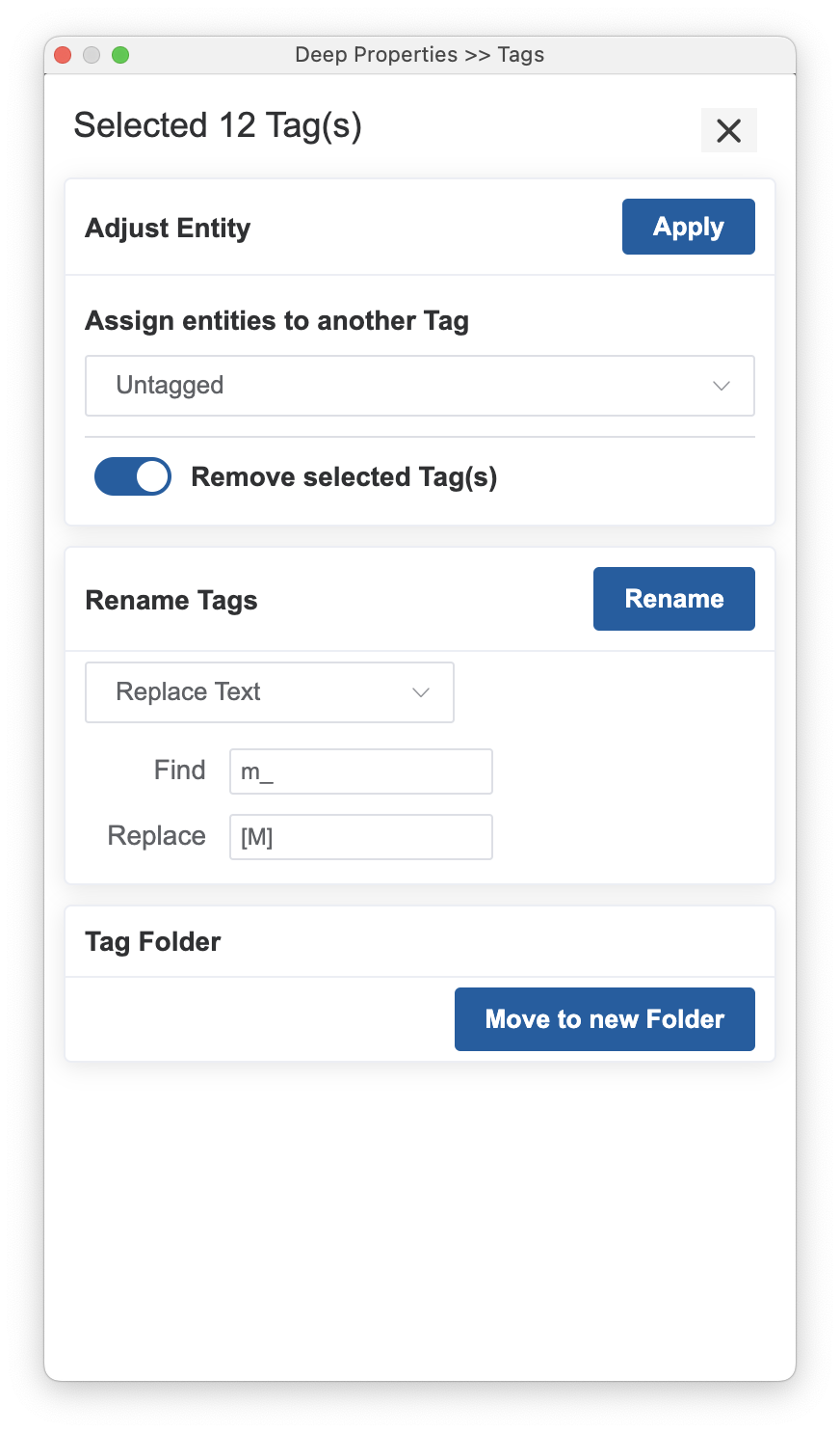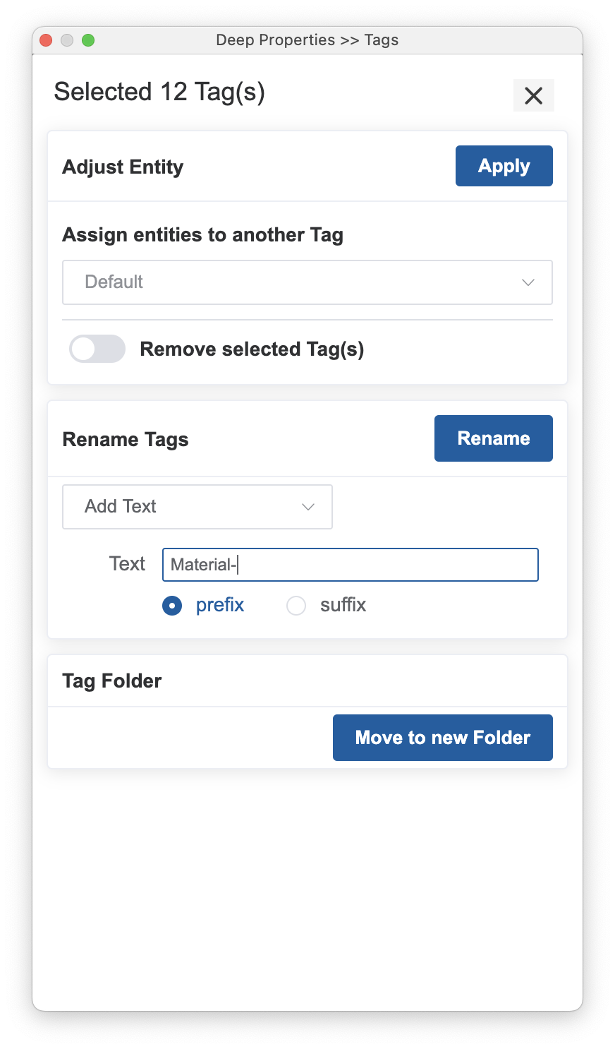 - Editing Function: Users can select and edit entities by tag, material, or type; remove unnecessary tags/materials; and rename them in bulk to optimize resource management.