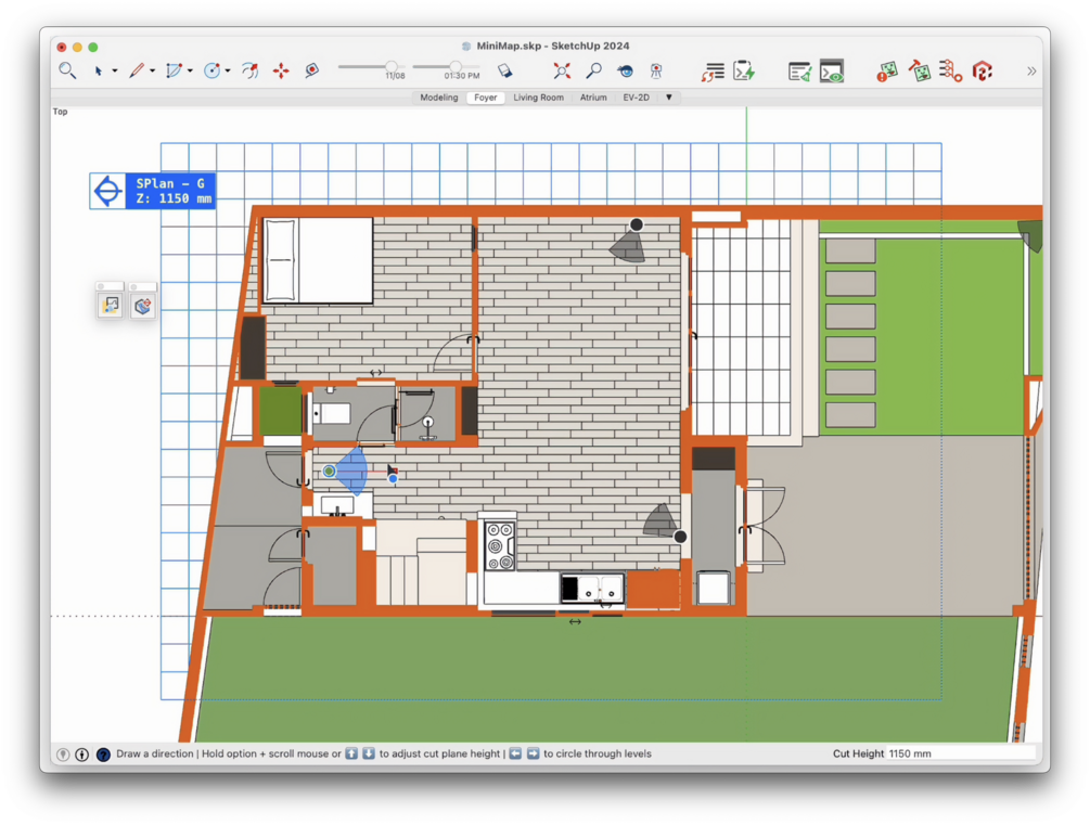 While SketchUp lacks near-clipping or multi-viewport support, MiniMap bridges that gap by generating a live 2D floor-cut that lets you pick positions and directions directly from the plan - just like a minimap in a game.